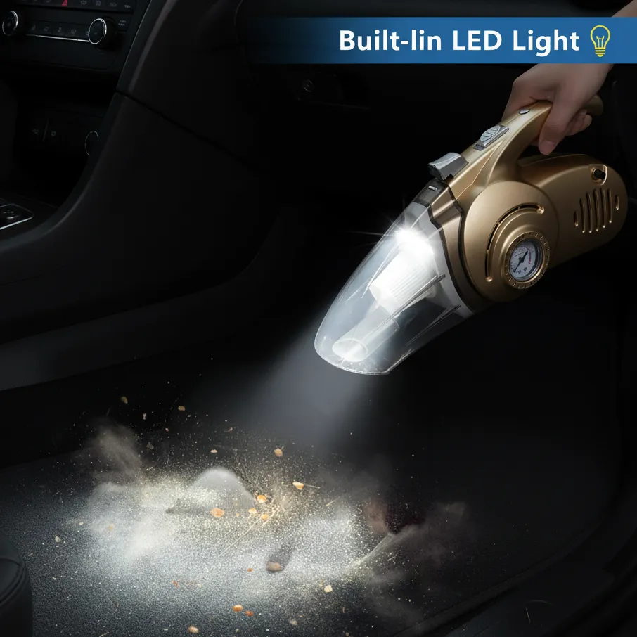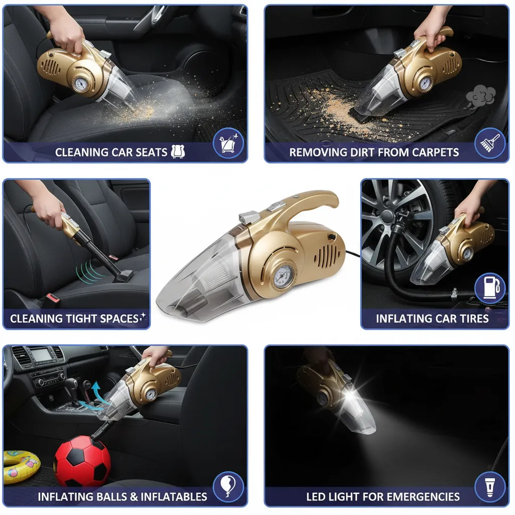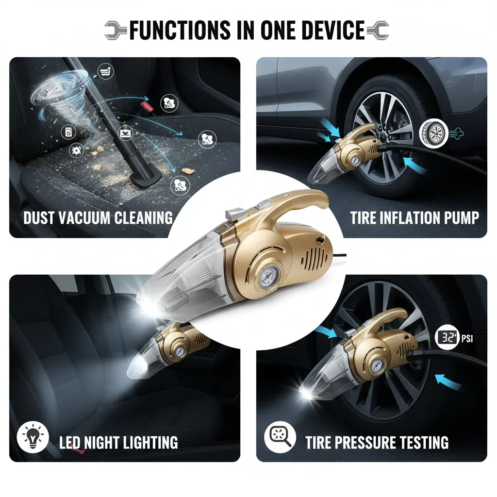 This versatile tool combines four essential functions in one unit: dust vacuuming, tire inflation, LED lighting, and tire pressure testing. Whether you’re cleaning your car interior or handling small emergencies during travel, this device is the perfect companion for every driver.