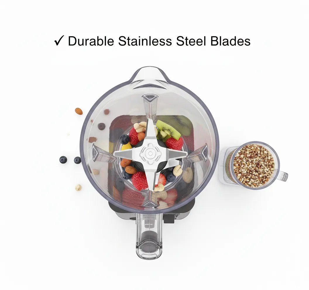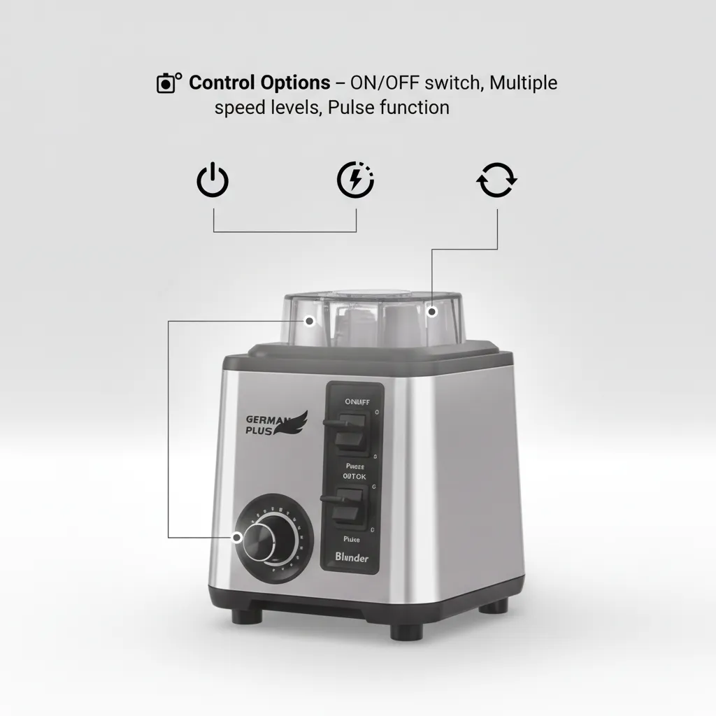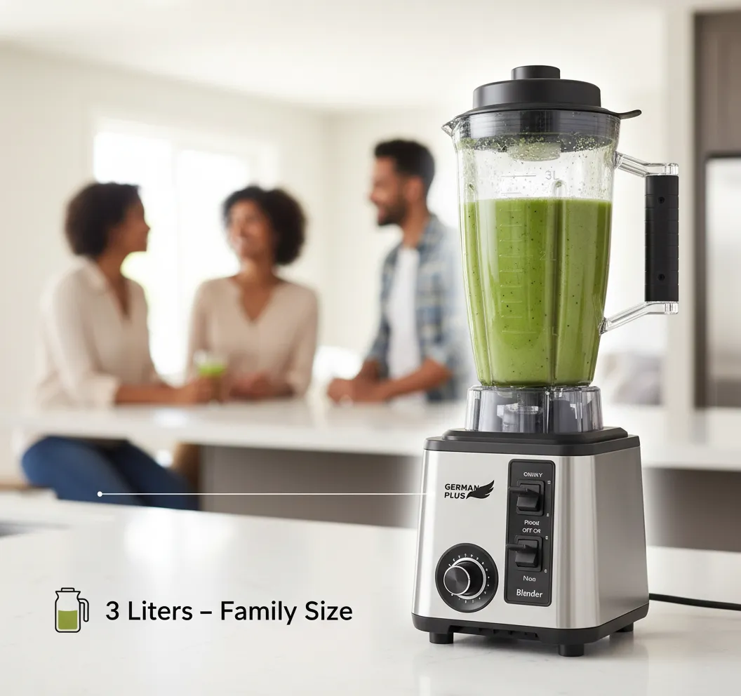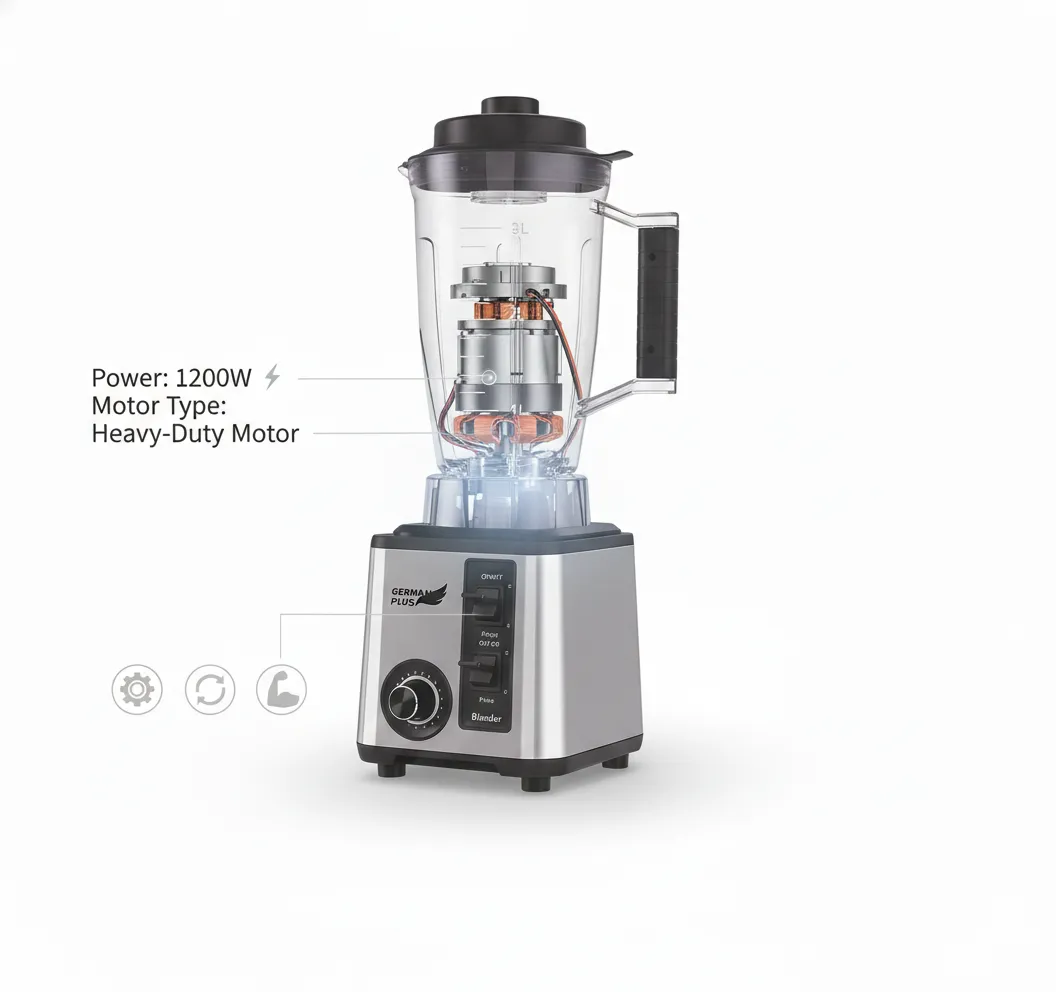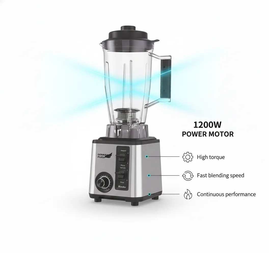 The German Plus blender is equipped with a 1200W high-performance motor that ensures fast, smooth, and efficient blending every time.