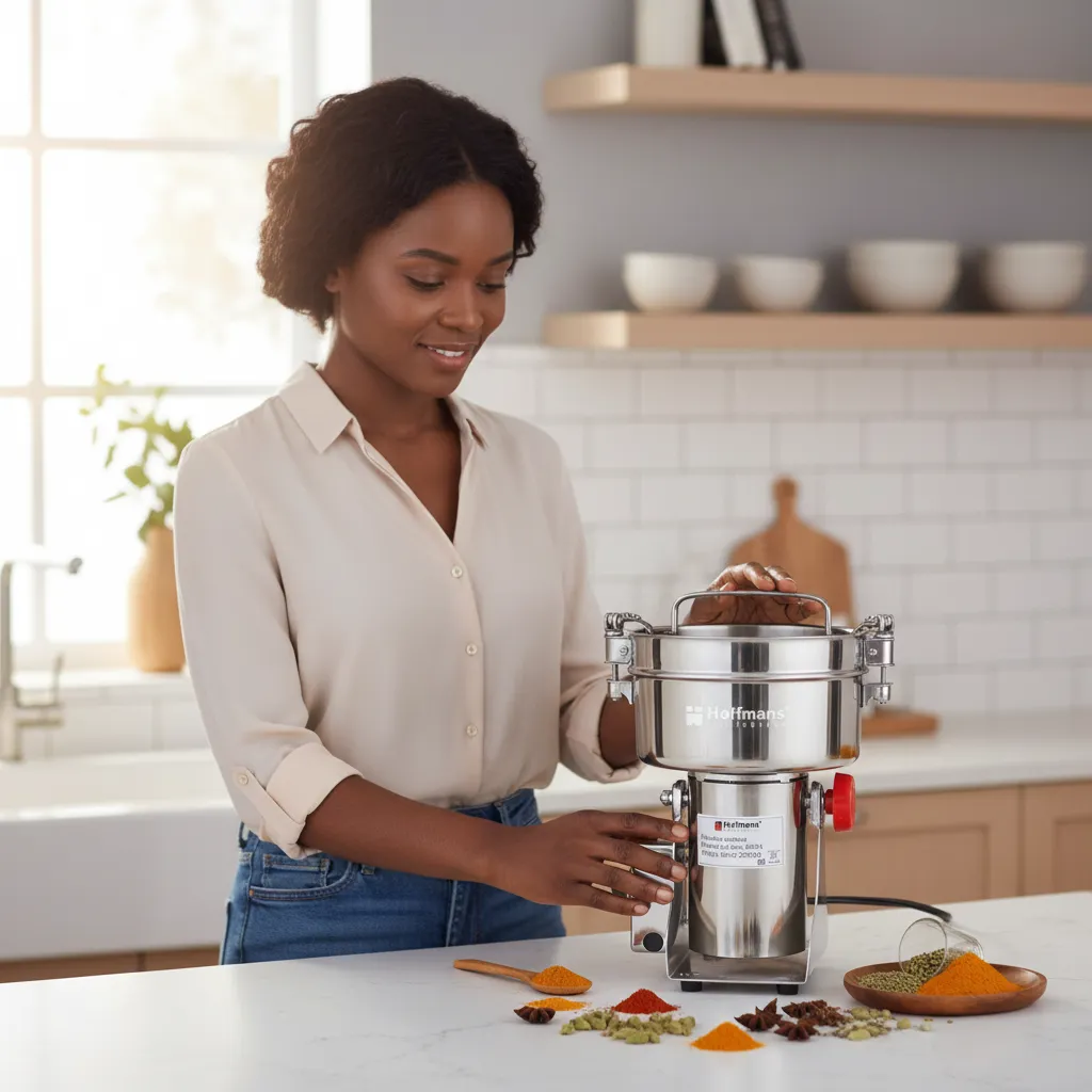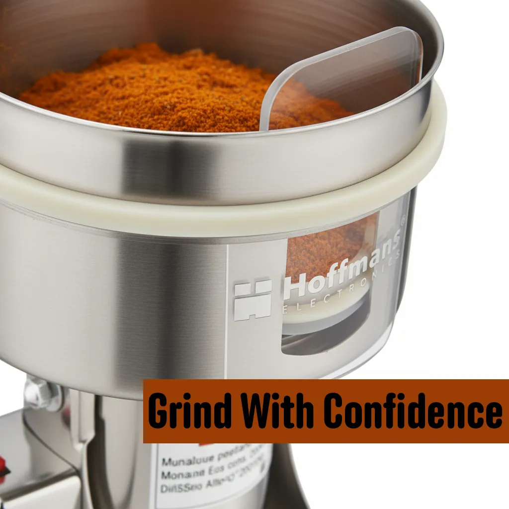 Hoffmans HM-9084 Multifunctional Grinder features a powerful 2200W motor and 400g capacity, delivering fast, fine grinding for spices, coffee, grains, and herbs. Durable stainless steel design with 18-month warranty