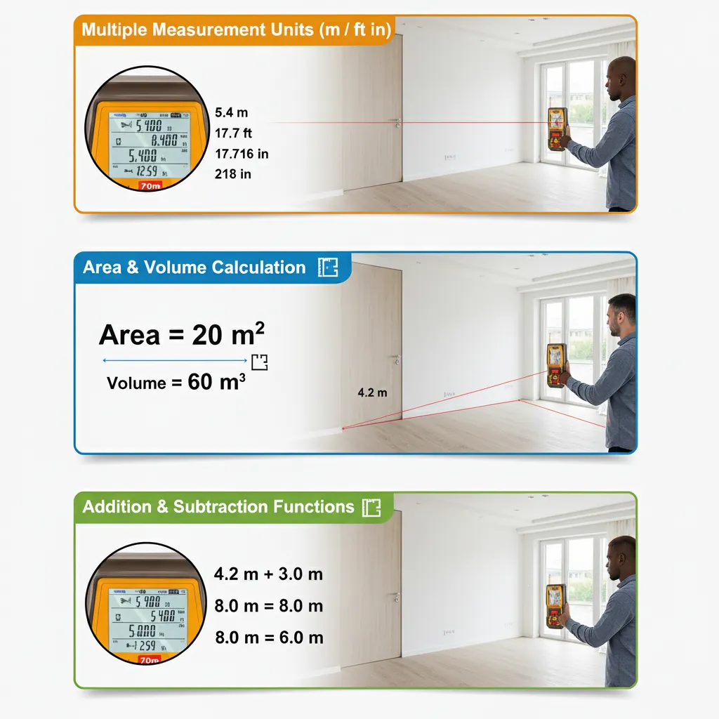 Stores previous readings and allows switching between meter, feet, and inch.