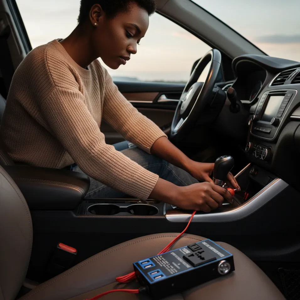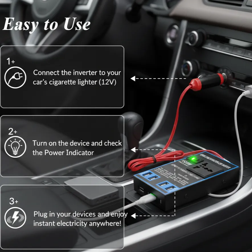 1. Connect the inverter to your car’s cigarette lighter (12V) 🔌