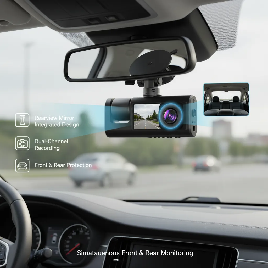 This dash camera works as a rearview mirror recorder, providing simultaneous front and rear monitoring.