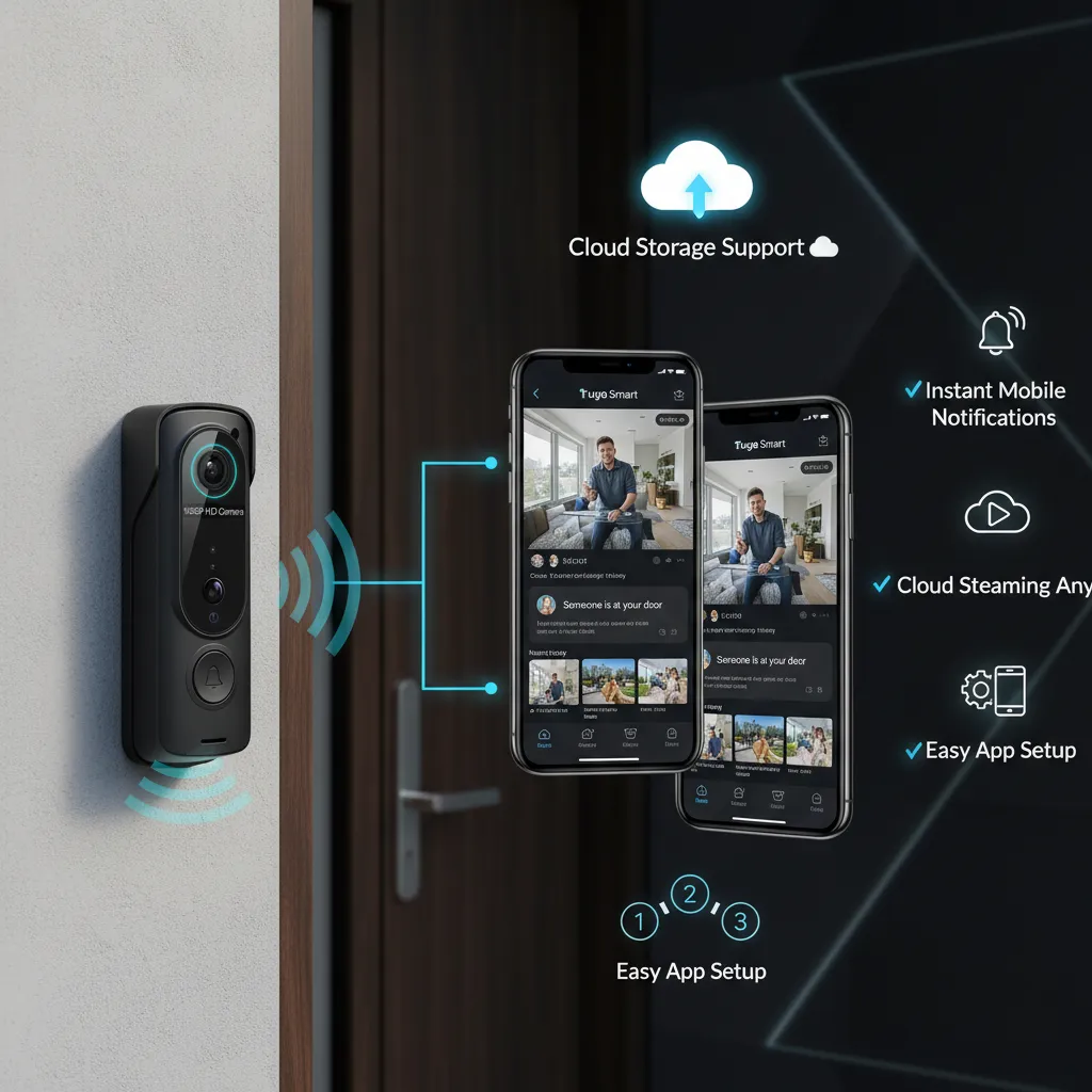 The doorbell connects via WiFi and works seamlessly with the Tuya Smart App (iOS & Android).